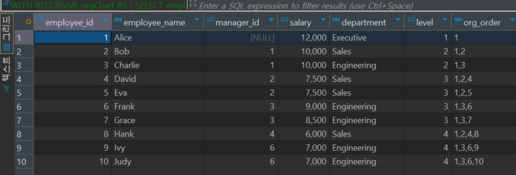 재귀 쿼리로 구한 orgchart를 조회해보면, 미리 구해 놓은 보고 체게 순서(org_order)가 있다.