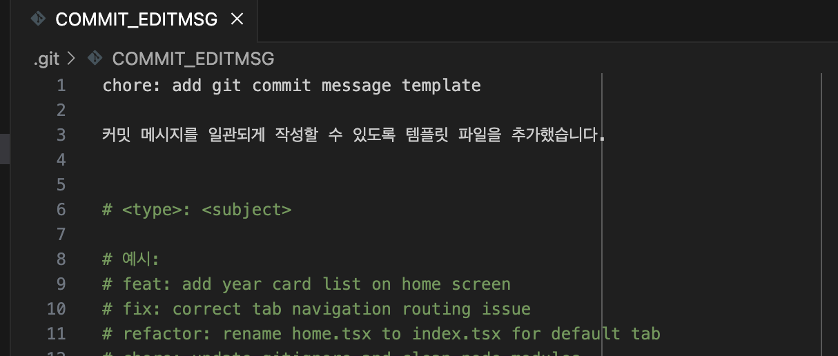 모든 설정을 마친 뒤 git commit 명령어를 실행하면,아래와 같은 작성한 템플릿 파일이 나옵니다.