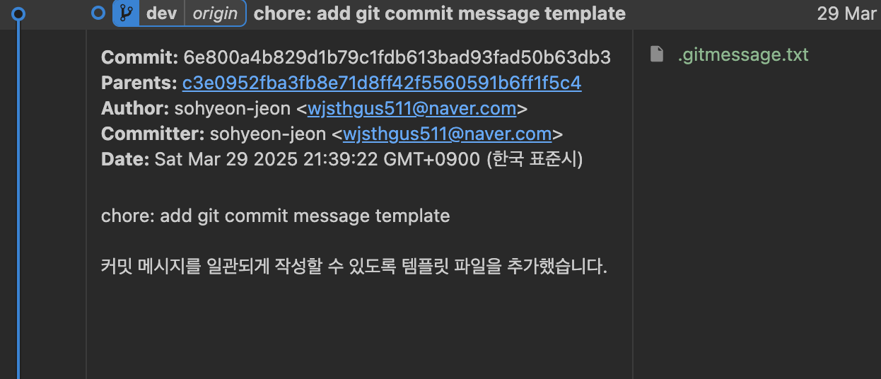 이럴 때 유용하게 쓸 수 있는 것이 바로 .gitmessage 템플릿 설정이에요.