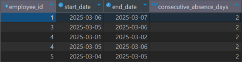 직원들이 결근한 날짜를 기준으로 연속적인 결근 기간을 계산해야 합니다. 예를 들어, 직원 1번은 2025-03-02와 2025-03-03이 연속적으로 결근이므로, 그 기간은 2일로 계산해야 합니다.